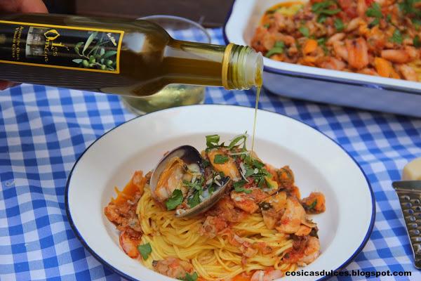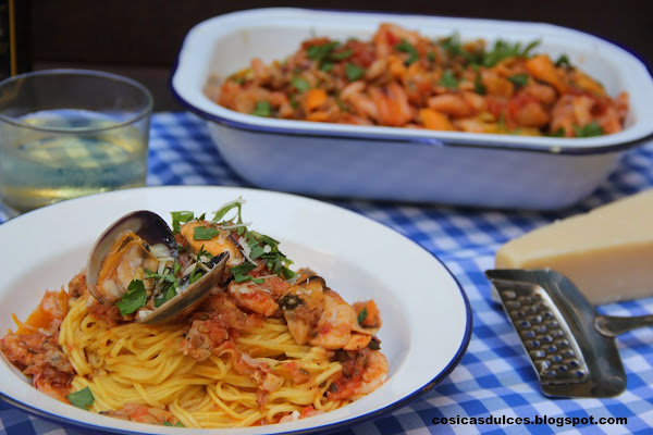 Cocinamos apenas un minuto más (el tiempo justo para que se hagan las gambas). Mientras tanto cocemos la pasta en el agua de la cocción de las almejas y los mejillones que teníamos reservada. mezclamos la pasta con la salsa. En el momento de servir espolvoreamos con un poco de perejil fresco, unas lascas de queso parmesano y regamos con un hilo de buen aceite de oliva (en mi caso un aceite sin filtrar).