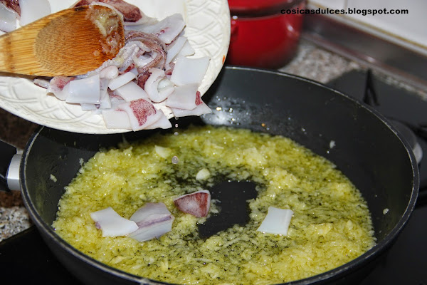 Pasamos ahora a preparar nuestra salsa. En una sartén con aceite de oliva freimos la cebolla rallada, los dientes de ajo laminados y la cayena. Cuando la cebolla comience a transparentar añadimos el calamar cortado a trocitos y lo dejamos cocinar a fuego lento.