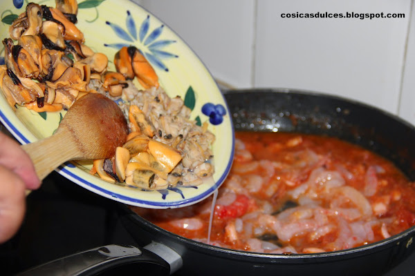 Inmediatamente incorporamos las almejas y los mejillones que habíamos cocido anteriormente y a los que le habremos retirado la concha.