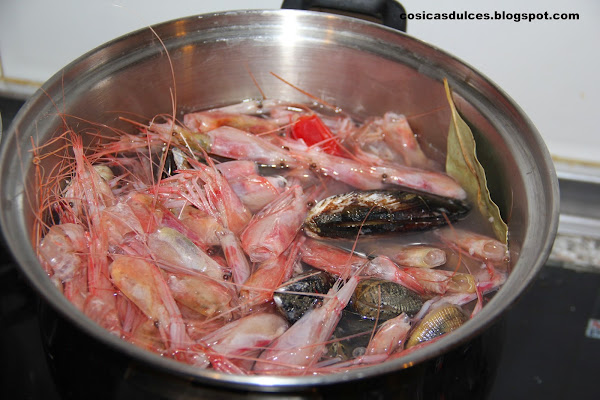 Comenzamos por hervir junto a un par de hojas de laurel las almejas, los mejillones y las cabezas de las gambas que habremos pelado previamente. Una vez que haya abierto el marisco, colamos el caldo y lo reservamos (será en este agua en la que coceremos la pasta).