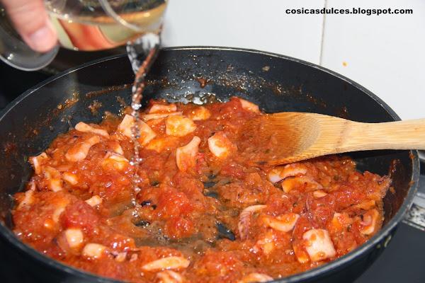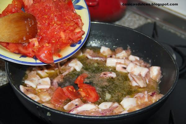 Cuando el calamar esté blandito añadimos los tomates: dos de ellos rallados y los otros cuatro pelados y cortados a cascos.