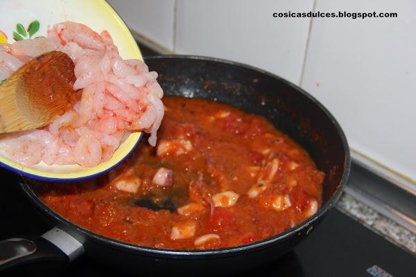 Añadimos las gambas que habíamos pelado con anterioridad.
