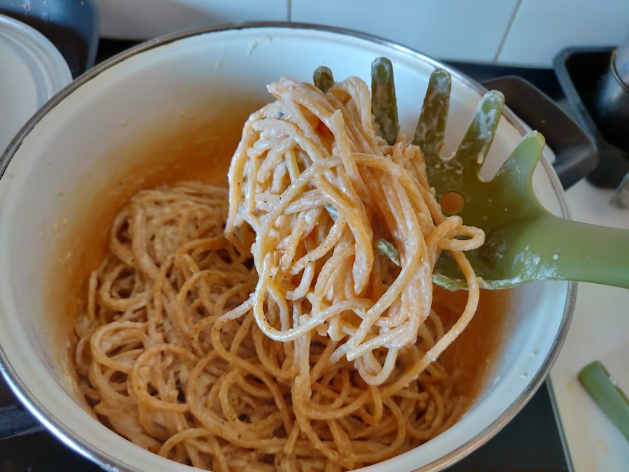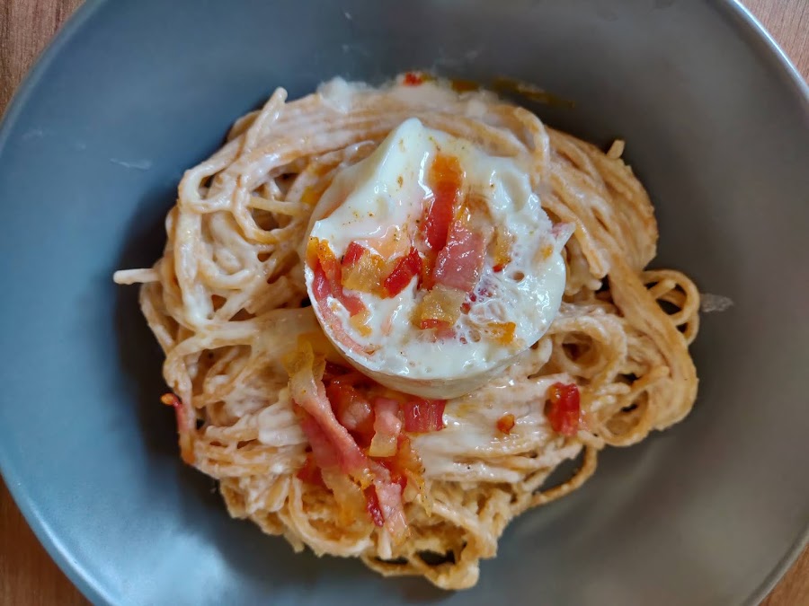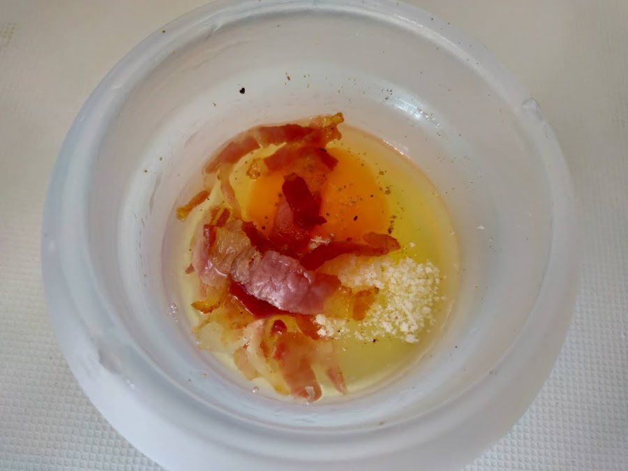 Es interesante guardar un poco de agua de la cocción para añadírsela si queremos que la pasta quede más cremosa. Sacamos el huevo del microondas y comprobamos la cocción, si os gusta más cuajado deberéis cocinarlo en tandas de 10 segundos, pero la gracia está en que quede muy poco hecho.