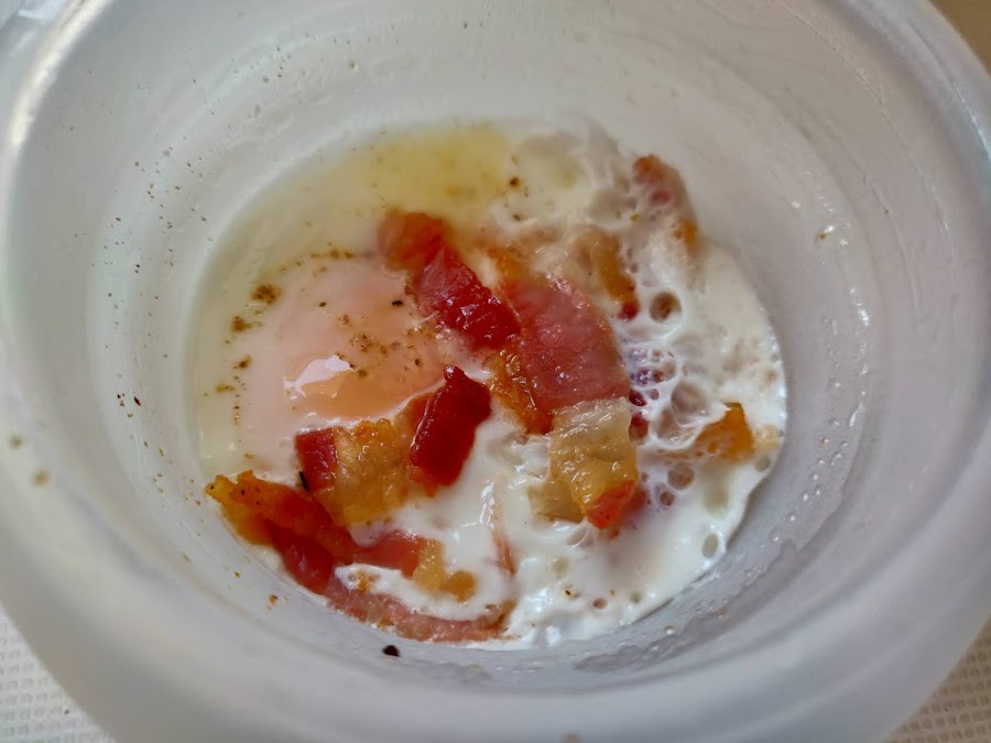 Añadir la mitad de las tiras de bacon y cocinar el huevo en el estuche a 700W durante 40 segundos.
