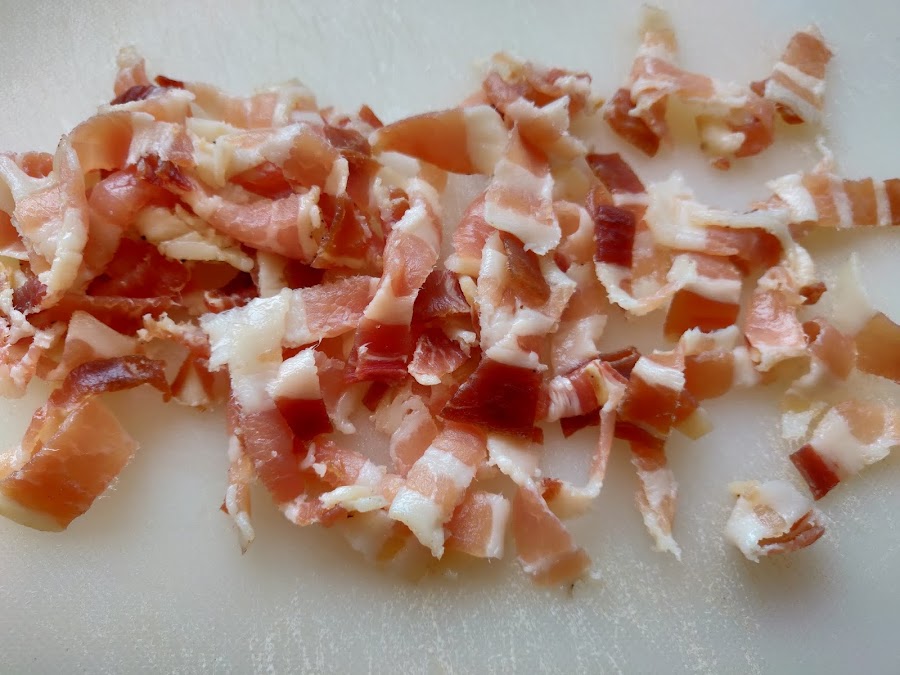A continuación cortamos el bacon de pavo en tiras finas.