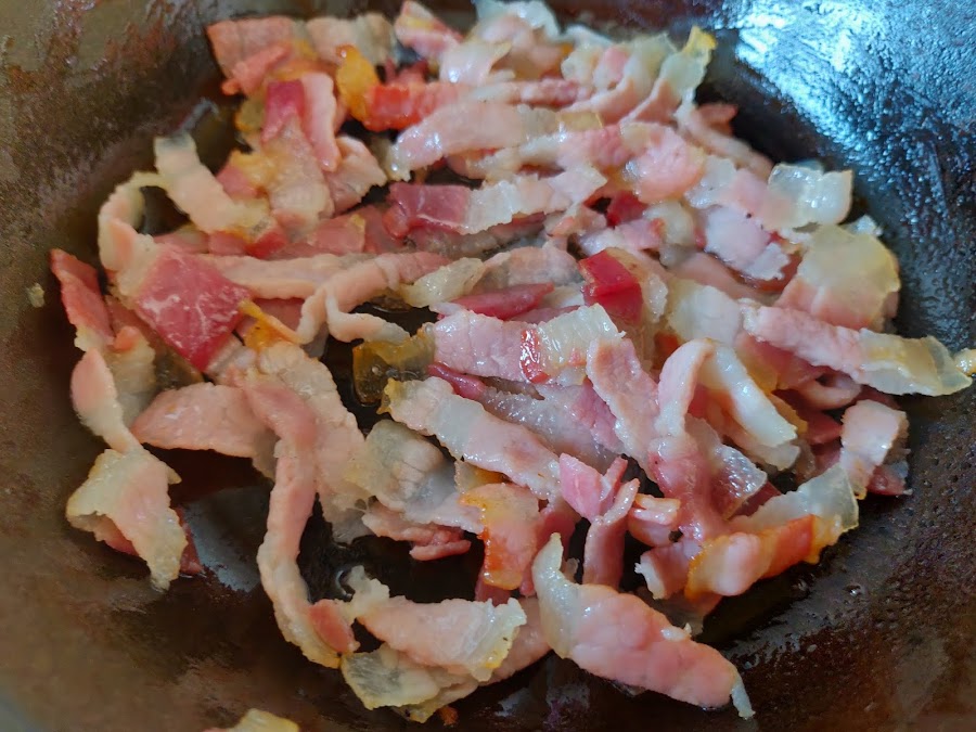 En una sartén, sin nada de aceite, tostamos el bacon y dejamos que se cocine con su propia grasa.
