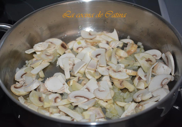 cuando empiece a dorarse, añadimos los champiñones cortados en láminas,