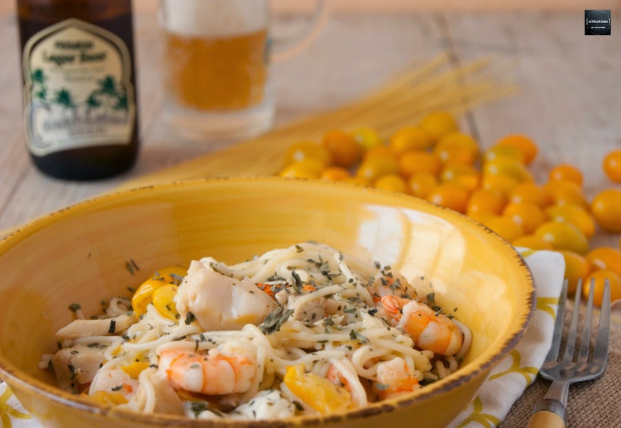 Para empezar con el lunes una receta de reciclaje, y es lo que tiene la pasta, que es un plato tan versátil que se le puede añadir lo que queramos. En esta ocasión se trataba de hacer limpieza en el congelador, donde aparecieron unas vieiras congeladas y langostinos. Además tenía unos tomates cherry amarillos que me habían regalado, por lo que completé el plato con ellos. Lo bueno es que es un plato no excesivamente calórico, al carecer de salsa alguna, y es precisamente lo que busco en estos platos, hacer una comida sin excesivas calorías. En esta ocasión hemos acompañado la pasta con una cerveza que nos gusta mucho en casa, como es la Cerveza Casablaca. Una cerveza que descubrí hace años, cuando viajé a Tánger, y que, desde entonces cada vez que la vemos en algún super la compramos. Para los expertos en cerveza no es una gran cerveza, sino una cerveza que atrae por su origen exótico, como es Marruecos, por su etiqueta que nos lleva al desierto y por su nombre, que recuerda a la mítica película del mismo nombre, donde el Rick más famoso de todos los tiempos la tomaba mientras ahogaba su amargura en ella. Para mi, que no soy excesivamente cervecera, me parece perfecta, ya que es muy suave. Aunque los expertos dicen que enseguida pierde su cualidad de refrescante y sacia poco la sed. De cualquier forma, a mi me gusta, y os la dejo como referencia cervecera.