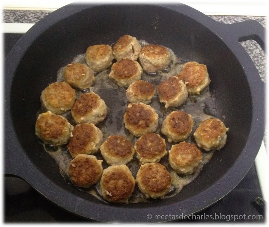 Cuando tengamos todas las albondigas listas, en una sartén grande las vamos friendo con un chorrito de aceite a fuego fuerte, para sellarlas por fuera pero que se queden crudas por dentro, ya que las acabaremos de cocinar cociéndolas en la salsa de tomate.