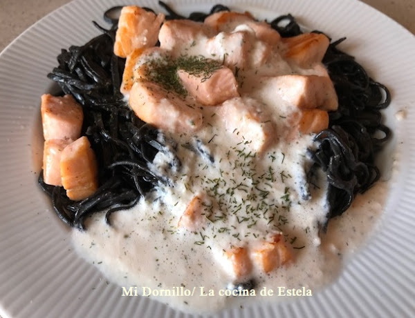 Servimos los espaguetis, con los dados de salmón y y la salsa. Espolvoreamos con eneldo al gusto.