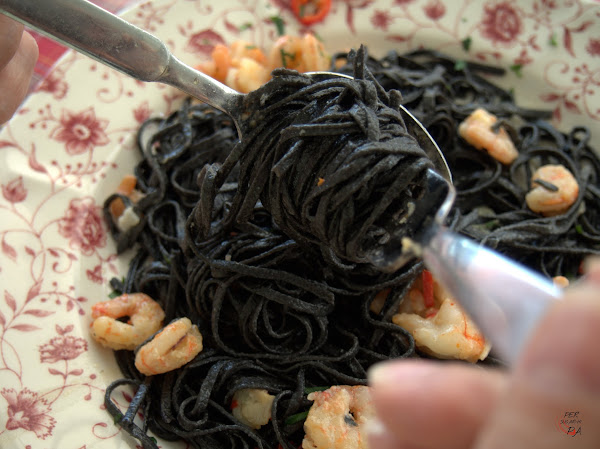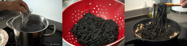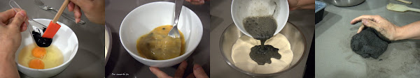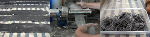 Preparar los ingredientes. Mezclar bien la tinta con los huevos, batiéndolos hasta que quede disuelta. Verter la mezcla sobre la semolina e ir integrando los dos ingredientes hasta conseguir una bola de masa, que acabaremos de trabajar a mano en la superficie de trabajo.