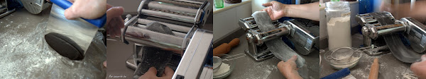 Primero dividir la masa en cuatro porciones más o menos iguales. Espolvorear bien la superficie de trabajo, la masa y los rodillos de la máquina con harina (semolina). Ir pasando la porción de masa hasta conseguir una tira del grosor deseado.