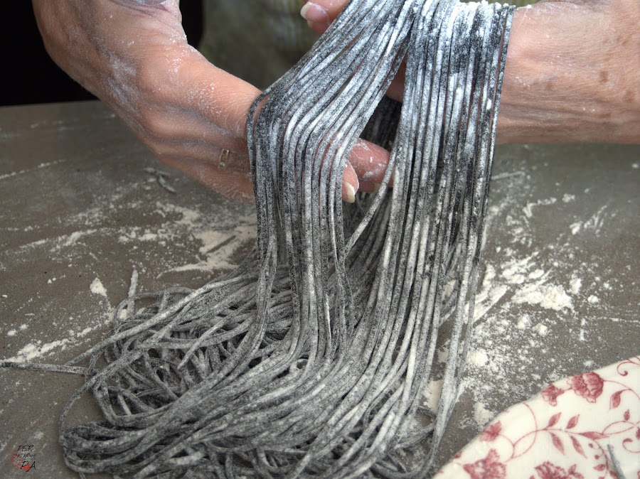 Enharinar los rodillos de corte, pasar las tiras de pasta y una vez cortados estirarlos sobre el paño. Una vez finalizado el proceso reservarlos hasta su utilización espolvoreándolos generosamente con semolina para que no se peguen. Los que no vayamos a utilizar inmediatamente, pueden congelarse, por ejemplo en una caja y bien espolvoreados con semolina. Cuando queramos utilizarlos, directamente al agua hirviendo, no dejar descongelar pues con la humedad podrían pegarse los unos a otros.