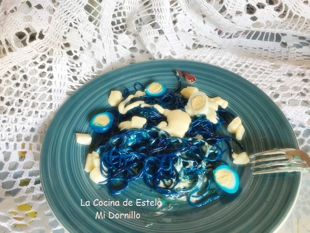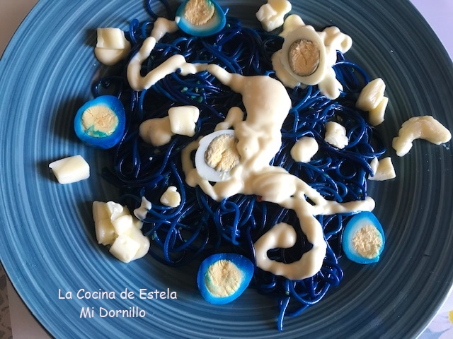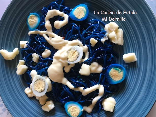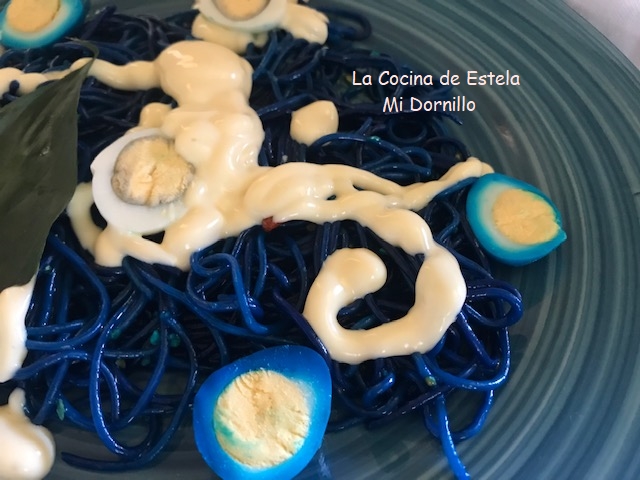 Divide la pasta en los platos para servir. Decora con los huevos partidos por la mitad, y huevos cocidos sin colorear.