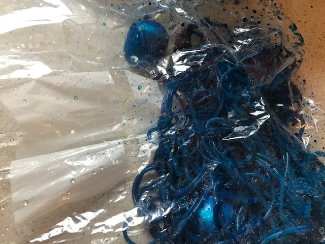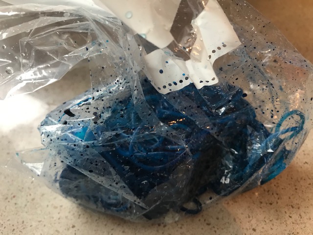 Añade colorante azul dentro de cada bolsa y muévelo bien por fuera que se reparta muy bien el colorante y se tiñan bien tanto los huevos como la pasta. Dale el azul deseado.