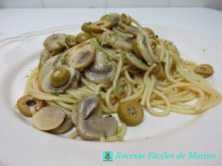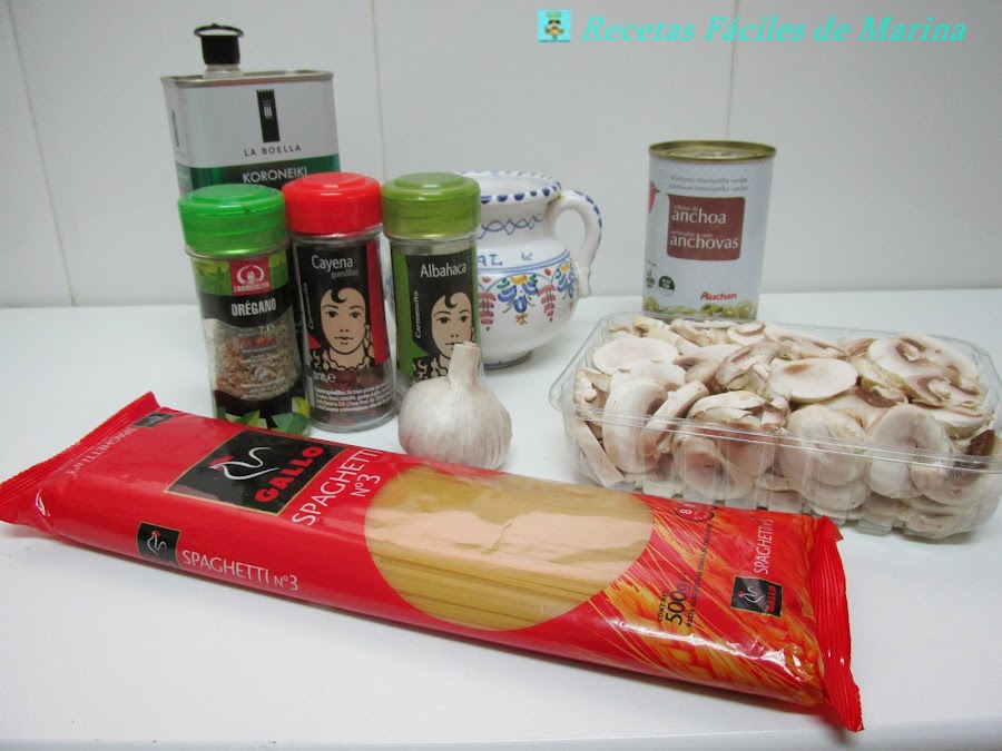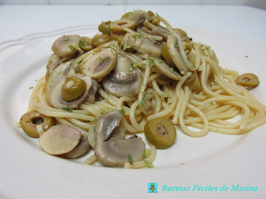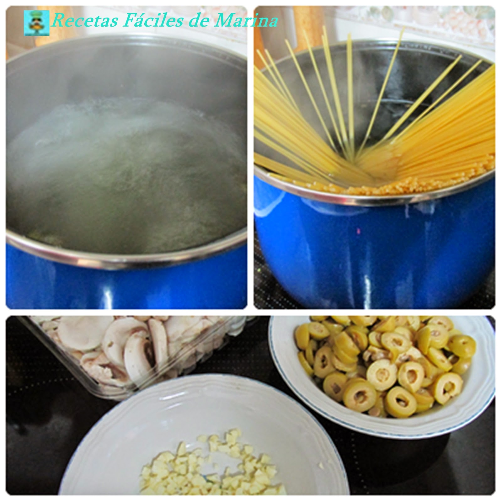Se pone agua a hervir con un puñado generoso de sal, un chorrito de aceite y las hierbas aromáticas (Albahaca y orégano). Cuando hierve el agua se introducen los espaguetis. Mientras laminamos el ajo, las aceitunas y los champiñones.
