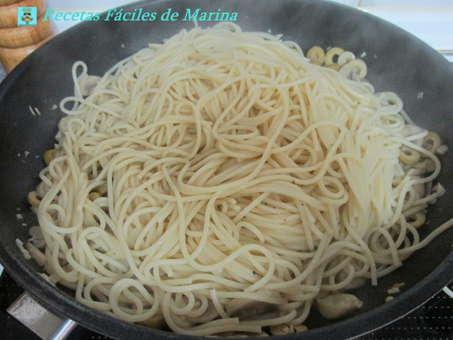 3. Cuando están hervidos los espaguetis escurrimos y echamos a la sartén con el resto de ingredientes, removemos a fuego lento para que se impregnen los sabores y servimos.