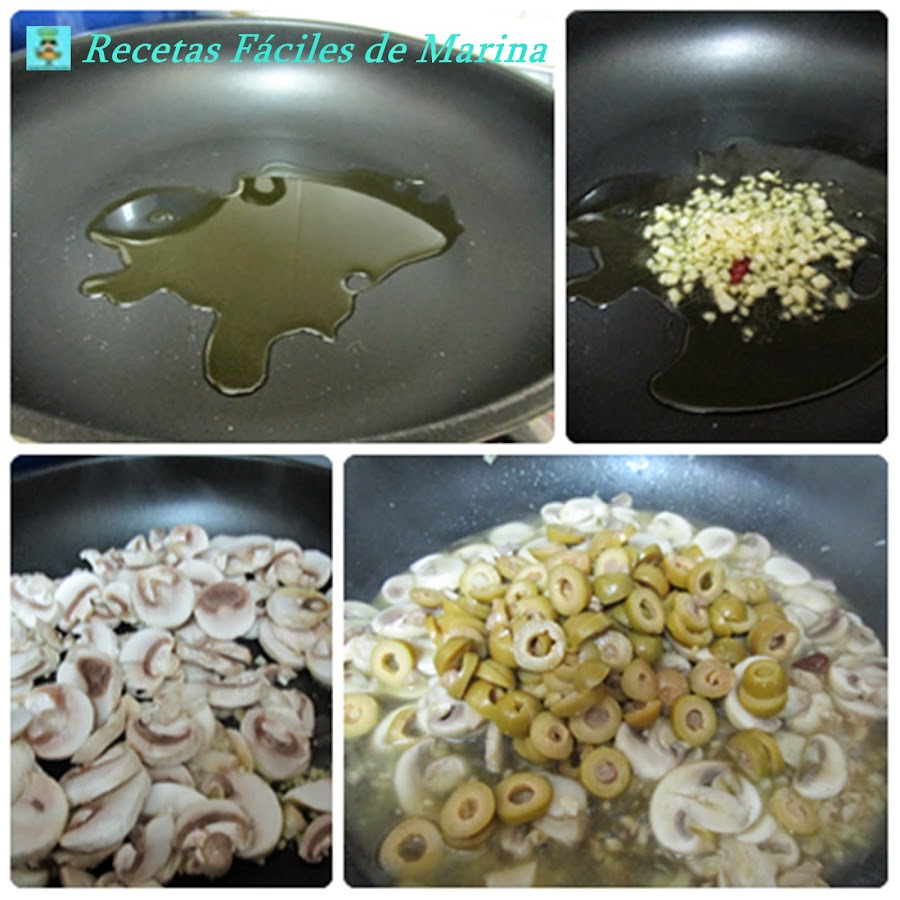 2. Calentamos un poco de aceite en una sartén y doramos levemente el ajo y la guindilla, acto seguido echamos los champiñones y un par de minutos después las aceitunas.