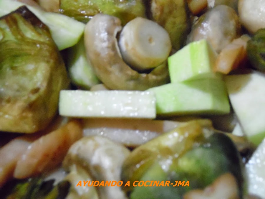 Esperar unos minutos y cuando comienzan a dorarse los champiñones agregar el calabacín pelado (opcional ) y partido en cuadrados grandes.