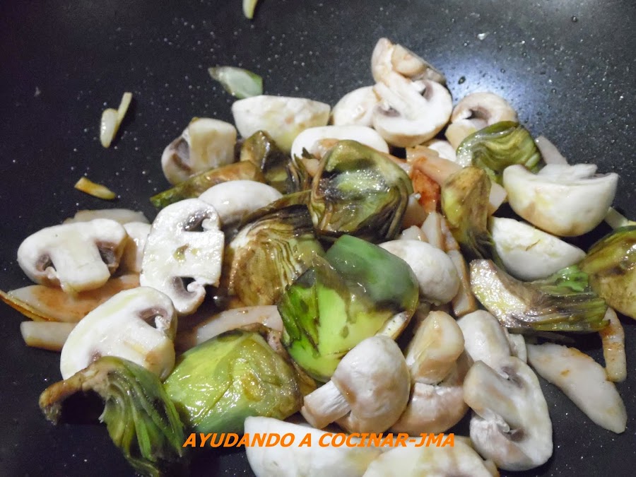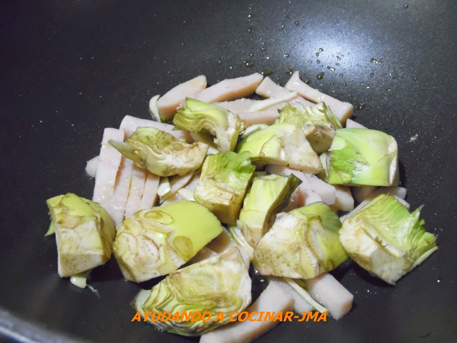 Remover y añadir las alcachofas ya limpias, partidas en cuartos