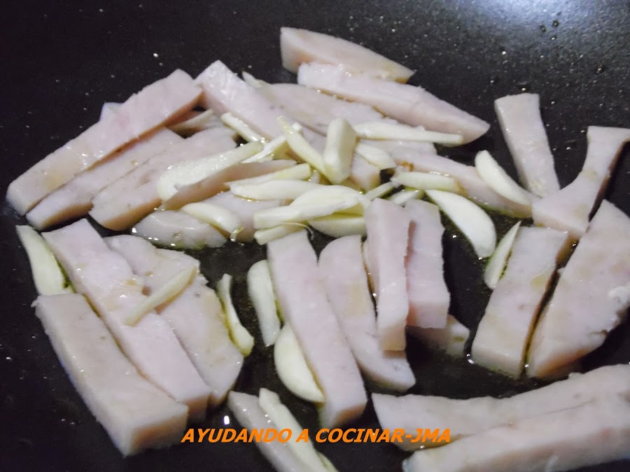 Echar las dos cucharadas de aceite de oliva virgen extra en una sartén , poner ésta a fuego medio y cuando empiece a calentarse el aceite incorporar el fiambre de pechuga de pavo y los dos dientes de ajo fileteados..