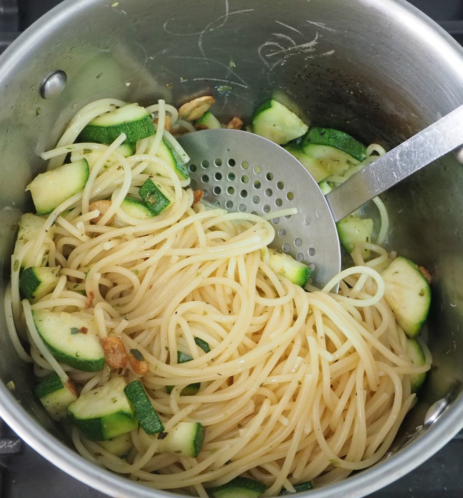 Desde que visité Roma hace ya muchos años se que la pasta es más que un plato de macarrones con tomate. De hecho, allí, este tipo de plato era de lo que menos abundaba. En cambio la pasta, con aceite crudo o rehogada era habitual. Y no me extraña porque queda divina. Además de infinitas posibilidades, los platos quedan ligeros y deliciosos. A mí me encanta rehogar la pasta, sobre todo cuando preparo espaguetis. Ya he traído al blog unas cuantas recetas cocinadas de esta manera. Además, me encanta añadir verduras y en esta ocasión me he decidido por el calabacín, una hortaliza fresca y suave que no me canso de comer de mil maneras. Con un toque de ajo y orégano, queda un plato aromático, ligero y sabroso. Para chuparse los dedos.