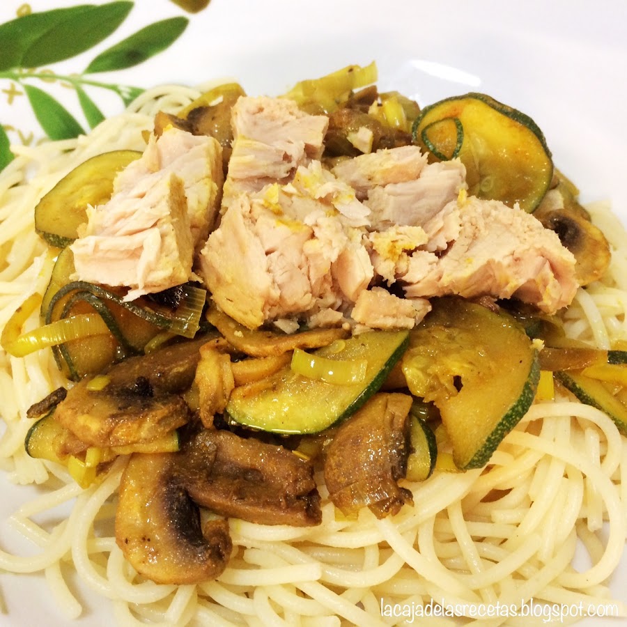 Ya sólo quedará emplatar en un plato hondo, ponemos una base de espaguetis, la verdura encima en el centro, y por último, el atún.