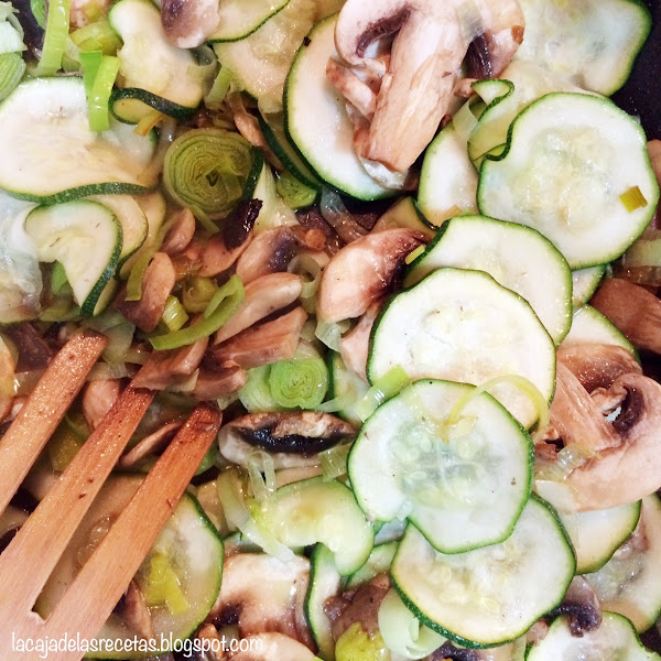 Poner a pochar en una sartén con un poco de aceite de oliva los dientes de ajo en rodajas. Ir incorporando el resto de la verdura a medida que vamos cortando, primero el puerro, también en rodajas, después el zucchini, en rodajas bien finas, y los champiñones en láminas. Dejar a fuego medio hasta que la verdura cambie de color, removiendo de vez en cuando con una cuchara de madera.