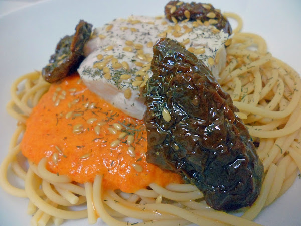 -Escurrir la pasta cuando esté hecha, servir al plato y añadir encima la salsa de piquillos, coronar con la pechuga de pollo (escurriendo el aceite antes) y adornar con los tomates secos, semillas de lino y eneldo.