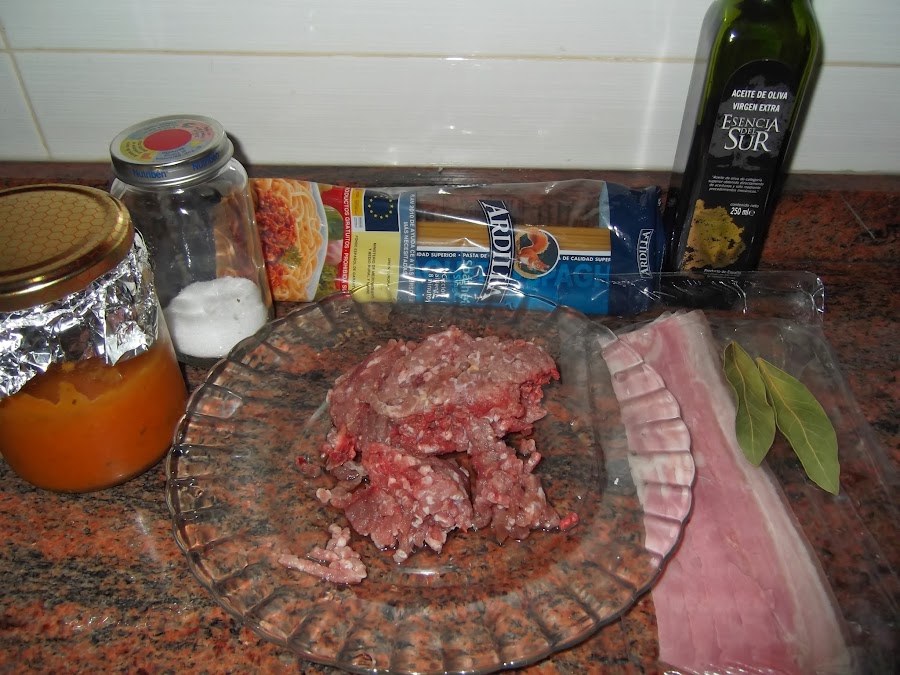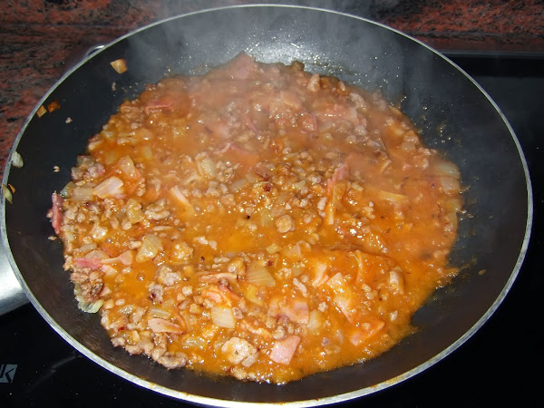Cuando la carne picada ya está cocinada, se añade el bacon bien cortado. Este ingrediente es opcional a mi me gusta añadírselo porque le ofrece buen sabor, pero si no lo tenéis en ese momento en la nevera no pasa nada.