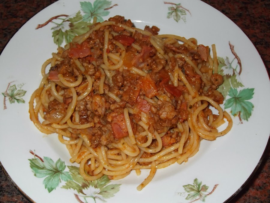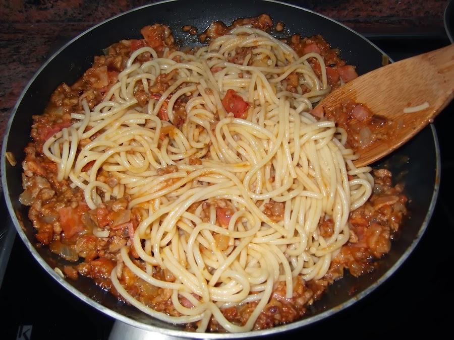 El último paso es añadir los espaguettis a la sartén y le dais un par de vueltas para que se mezclen todo los ingredientes y ya están listos para comer. En ciertos restaurantes, prefieren aliñar la carne picada, sin embargo a mi me gusta más sin aliñar para que no le ofrezca al plato un sabor muy fuerte.