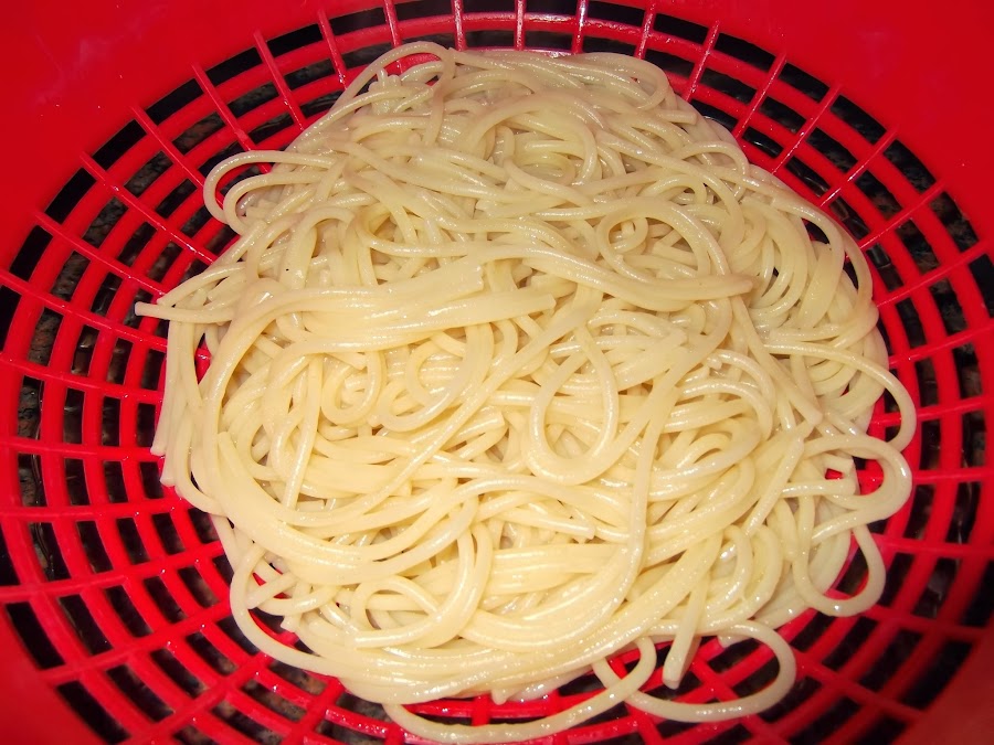 Mientras tanto ponemos a cocer la pasta con agua, un chorro de aceite, dos hojas de laurel y un poco de sal. Fijaros en el paquete que os dirá el tiempo que tiene que estar que será alrededor de diez minutos. Luego la ponéis a escurrir y le echáis un poco de agua fría por encima para que no se apelmace.