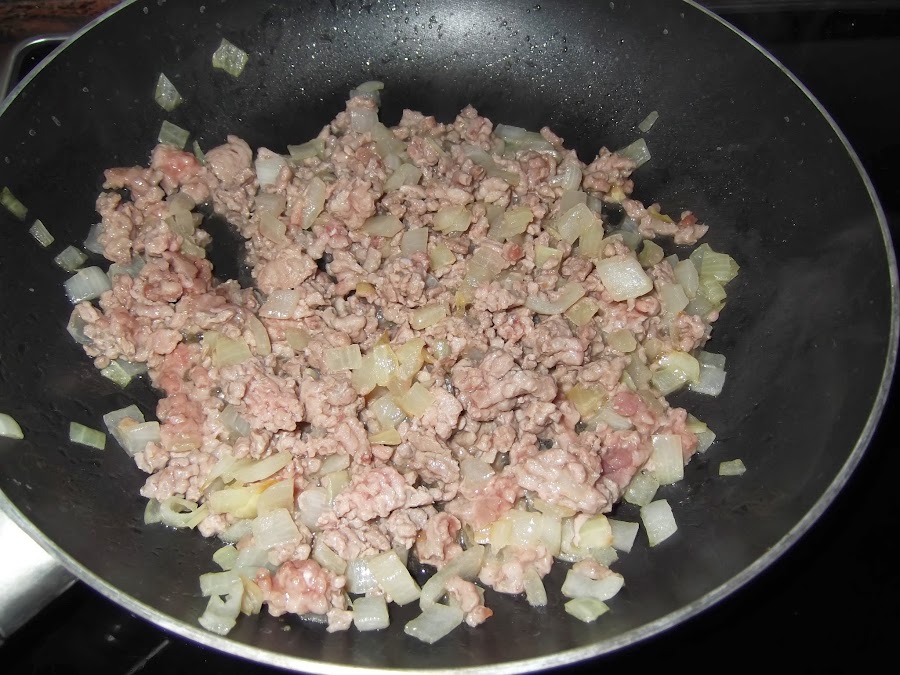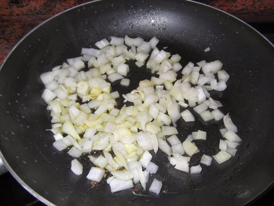 Lo primero que hacemos es echar un poco de aceite en la sartén y cortar la cebolla en trozos pequeños. Se pone a dorar la cebolla en la sartén y cuando haya cogido el suficiente color, se echa la carne picada y se desmenuza con la cebolla.