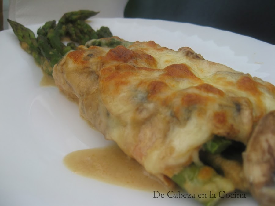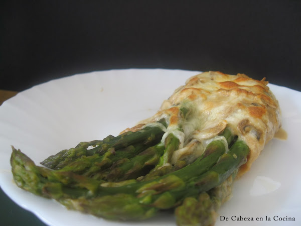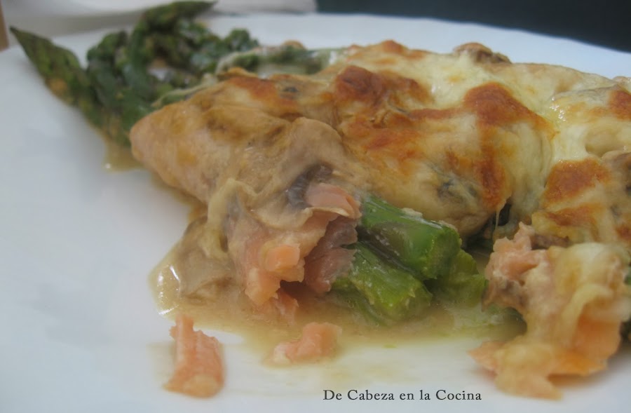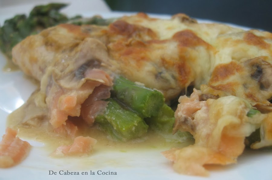 Delicados, fáciles de hacer, contrastan muy bien los sabores del esparrago y el salmón a los que la bechamel complementa muy bien. En su propuesta, Jose hace una bechamel de calabacín pero como yo no tenía, preparé una bechamel y le agregué unos champiñones que si tenía y quedó igualmente estupenda.