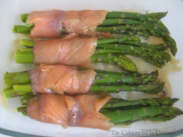 Cuando estén listos, escurrirlos, envolverlos en Salmón, colocarlos en un recipiente que pueda ir al horno, regar por encima la salsa bechamel con suavidad para que no se rompan los espárragos, regar por encima el queso y meter al horno pre calentado a 180º, o puedes ponerlos en el horno microondas en el gratinador unos minutos. por unos minutos hasta que dore.