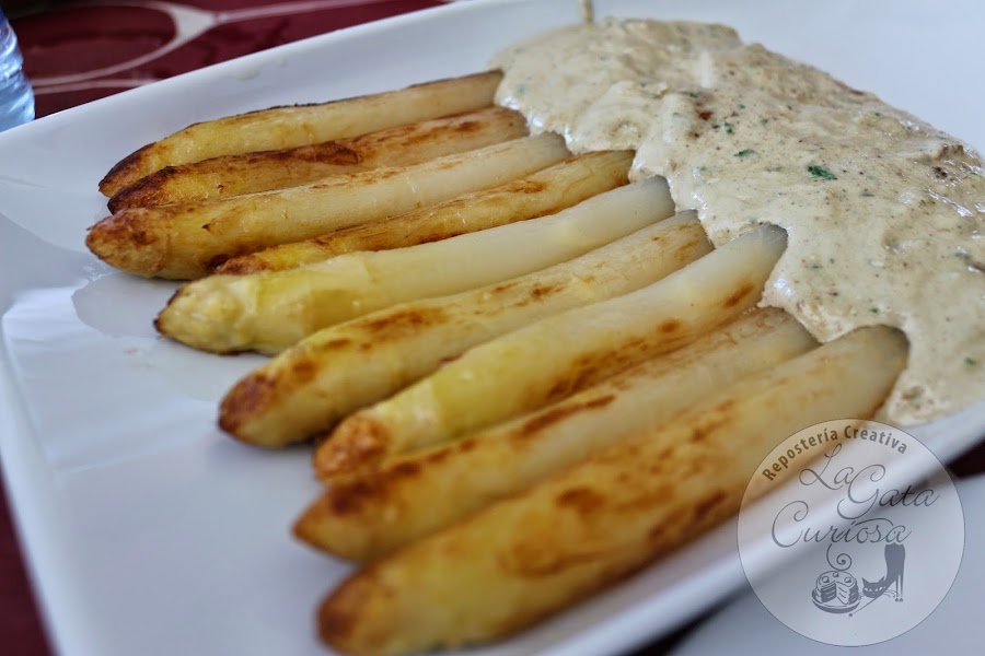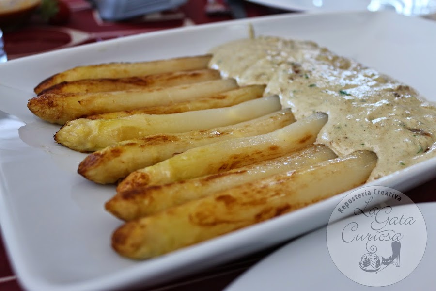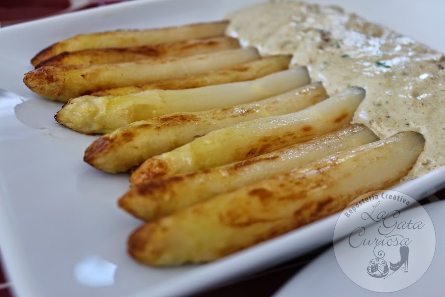Poner una sartén amplia a calentar con un poco de aceite, dorar los espárragos por todos los lados, pasar a una fuente de servir, en la misma sartén calentar la salsa durante un par de minutos, poner la salsa en la parte baja de los espárragos y servir inmediatamente.