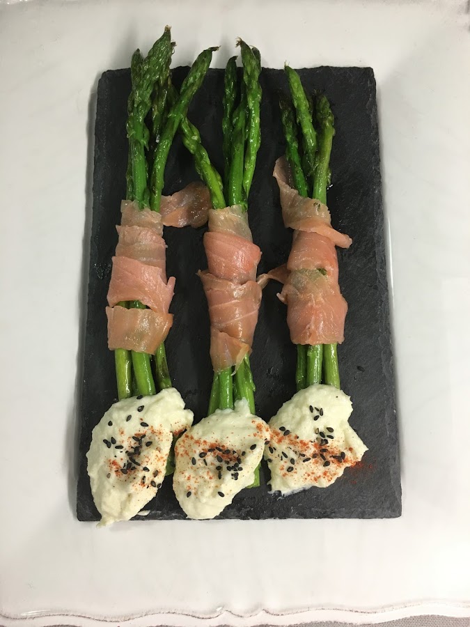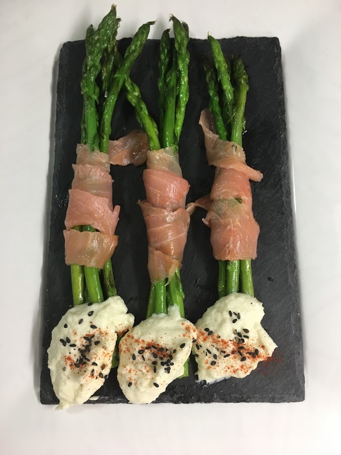 Se envuelven manojitos de espárragos en una tira larga de salmón ahumado cada uno y se sirven con la brandada de bacalao espolvoreada con sésamo negro y pimentón. SE comen de inmediato.