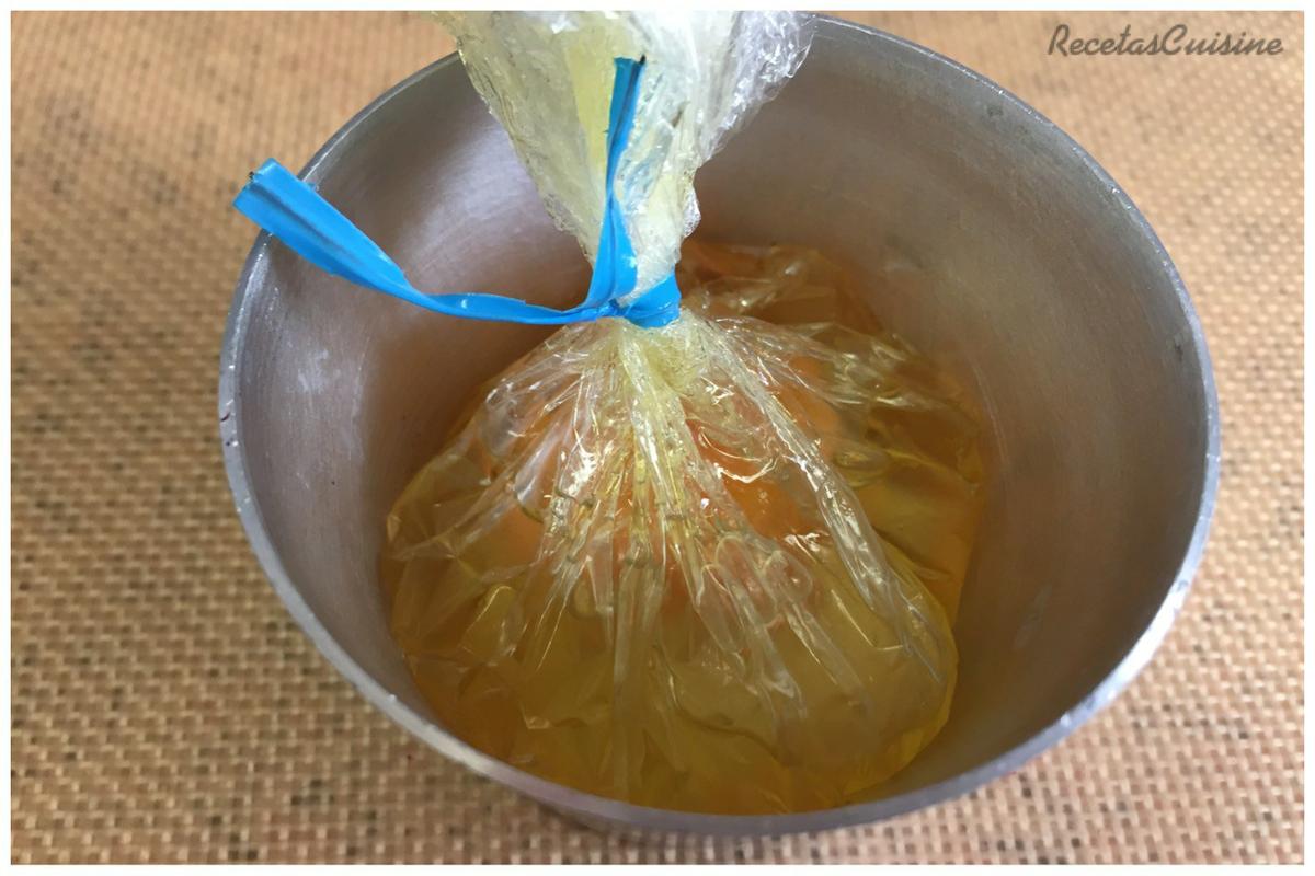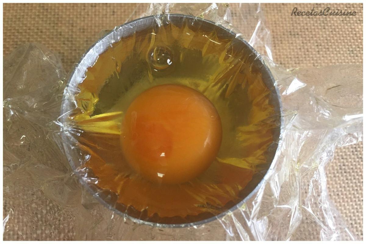 5. Mientras, cortamos un cuadrado de papel film por cada huevo, lo untamos con una pizca de aceite y lo colocamos en una flanera metálica o en un vasito. Cascamos el huevo dentro del vaso y hacemos un saquito que cerraremos con un hilo o con un alambre de estos que usamos para cerrar las bolsas.