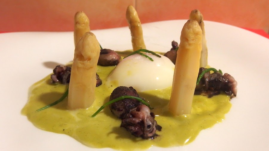 Al fondo del plato poner un par de cucharadas de la salsa holandesa. En el centro pondremos el huevo cocinado a baja temperatura y alrededor las sepietas, las puntas de espárrago blanco y los brotes de salicornia.