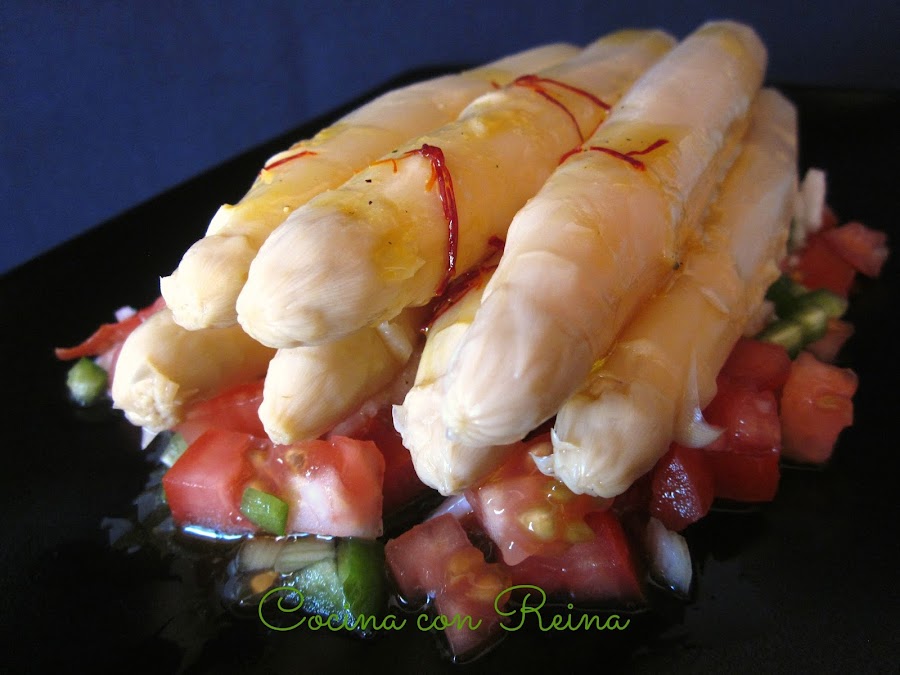 Mezclamos ya todos los ingredientes de la vinagreta y servimos montando, la cama de pipirrana, encima los espárragos y cubrimos con la vinagreta.