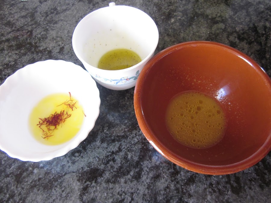 Las hebras de azafrán las ponemos en una cucharada de agua caliente y las dejamos dos minutos.