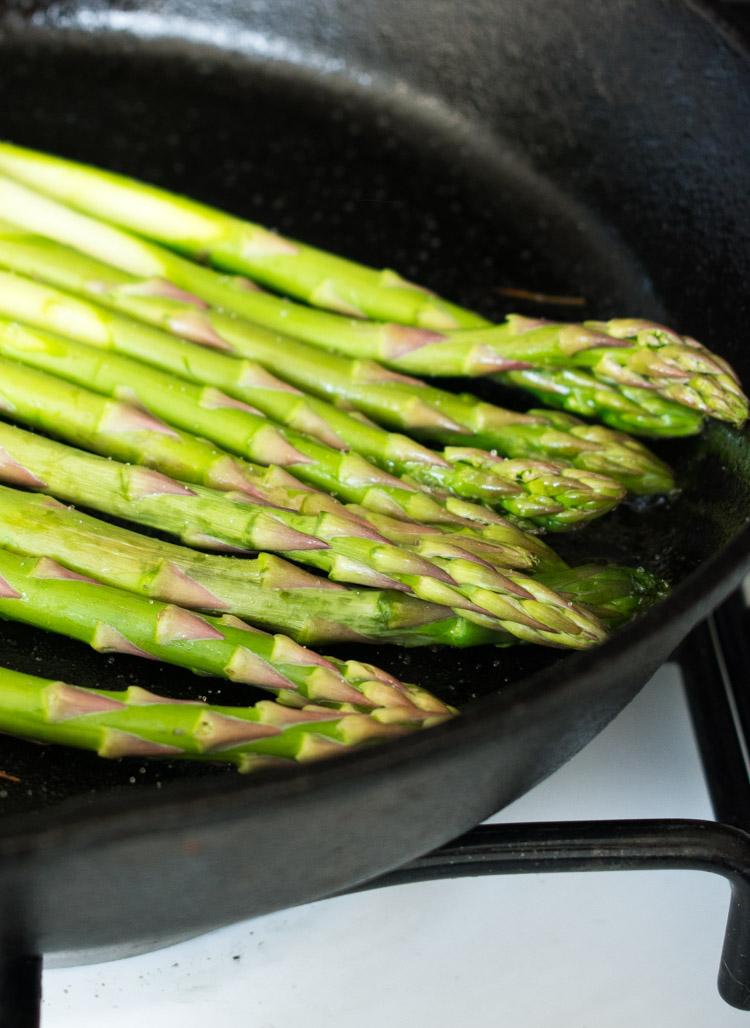1En un sartén calentar a fuego medio un chorrito de aceite de oliva. Asar los espárragos con un poco de sal.