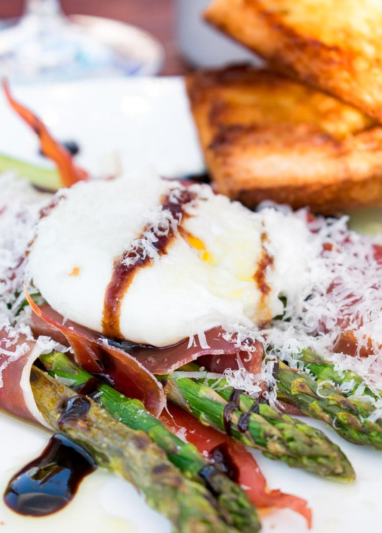 3Colocar cuidadosamente el huevo sobre los espárragos envueltos. Terminar con un chorrito de aceite de oliva, otro de crema de balsámico, y parmesano recién rallado por encima.