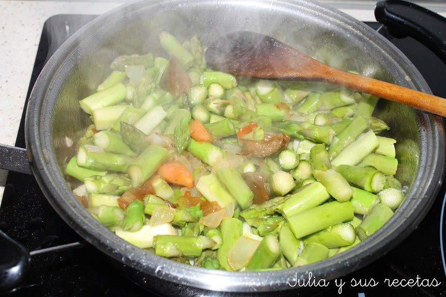 Se añaden los espárragos troceados y cuando estén rehogados se añade la harina.