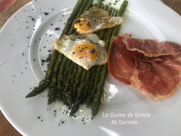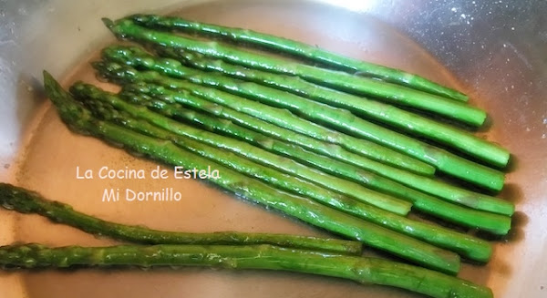 En una plancha o sarten le damos un toque a los espárragos con un hilo de aceite sin hacerlos mucho, dorarlos simplemente.
