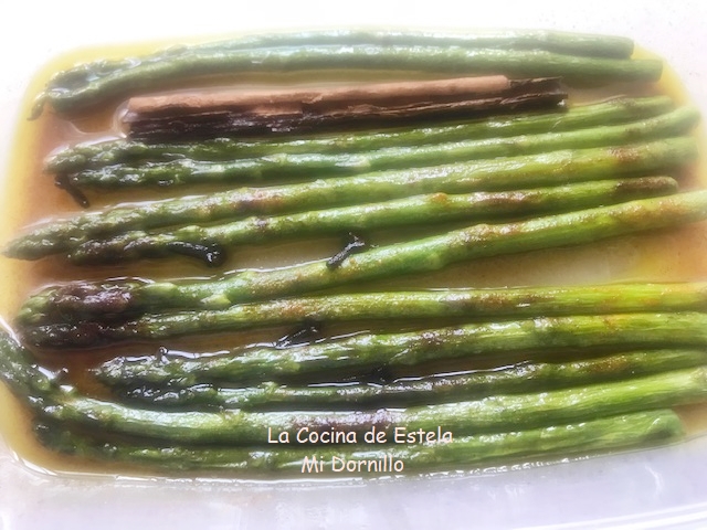 En una tartera metéis los espárragos, en aceite de oliva virgen, clavos, canela y azafrán en hebras o en polvo. Tapa y mételos en la nevera, yo los tuve tres días.