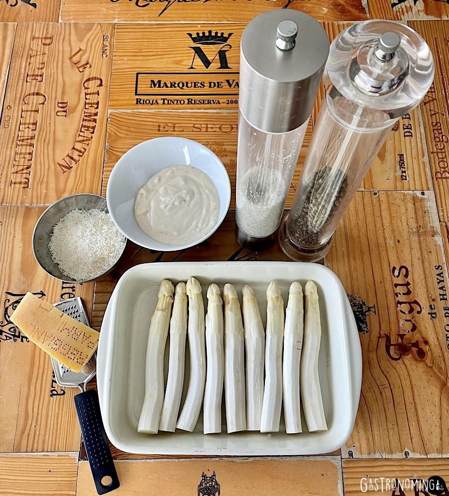 Aprovechando entonces la temporada de espárragos blancos, vamos hacer esta sencilla receta para disfrutarlos de una manera distinta de lo habitual. Para saber como cocer unos espárragos frescos, esto te lo enseñamos en nuestra receta Espárragos blancos a la plancha verás que es más fácil de lo que piensas. En cuanto a la salsa bechamel o salsa blanca y si aún no la tienes o no la haz hecho, te lo explicamos en la sección de NOTAS de nuestra receta Lasaña de espinacas y gambas, puedes usar tranquilamente esta receta, pero una recomendación, usa menos leche para que te salga más espesa y cuando este fría, añádele un huevo crudo y bátela bien, esto ayudará a que no solo sea más densaE, sino que cuando se cocine en el horno, el huevo cuajará y le dará una consistencia espectacular. Si no quieres complicarte, puedes usar la receta tradicional, pero acepta esta recomendación, no te arrepentirás y el poco tiempo que te toma hacerlo vale toda la pena del mundo.