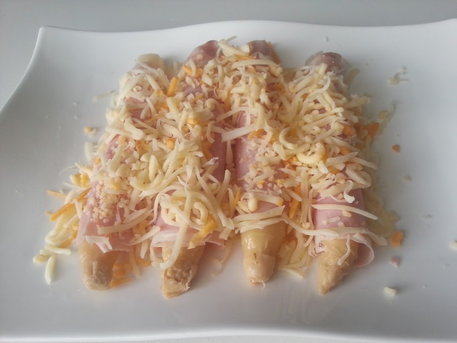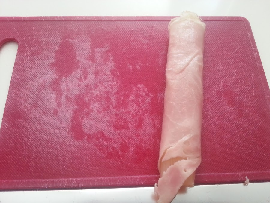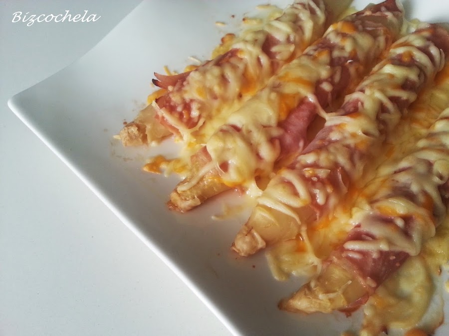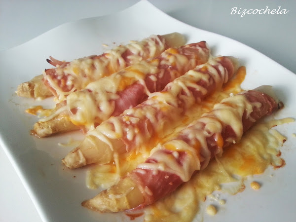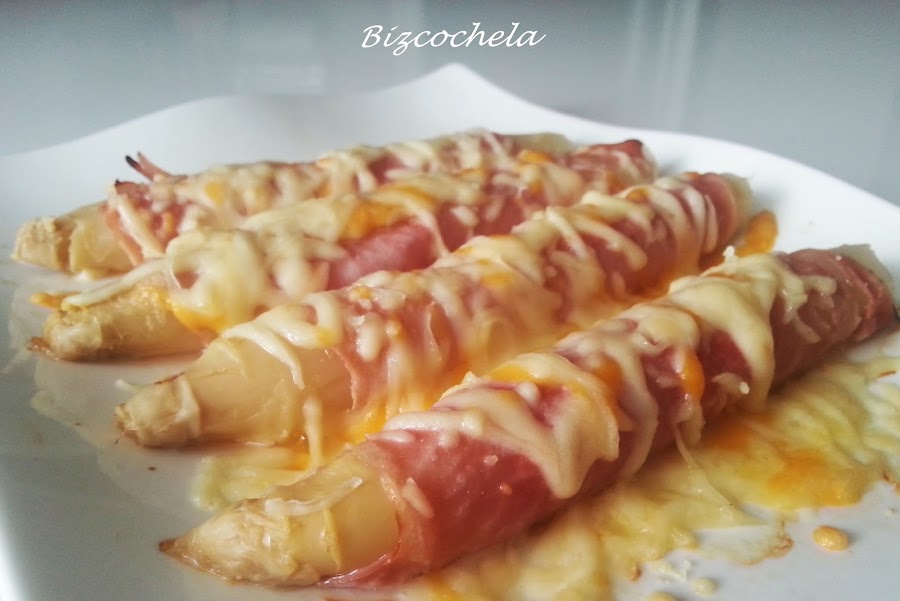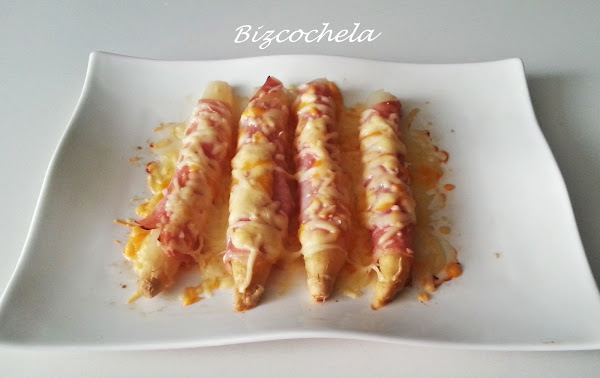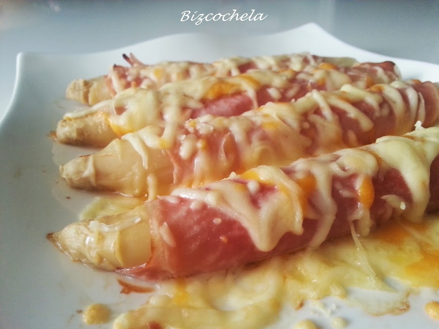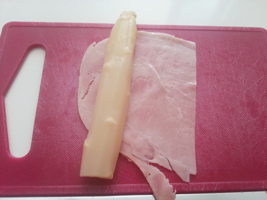 1. - Encendemos el horno a 200 ° y vamos preparando los espárragos. Extendemos una loncha de jamón (media si es muy grande) y colocamos un espárrago en un lado.