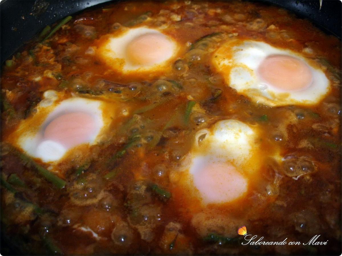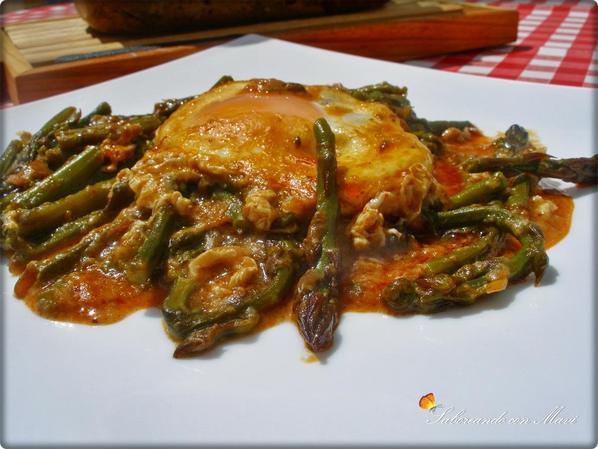 Ahora cascamos los huevos y los cuajamos en la sarten con loa espárragos.