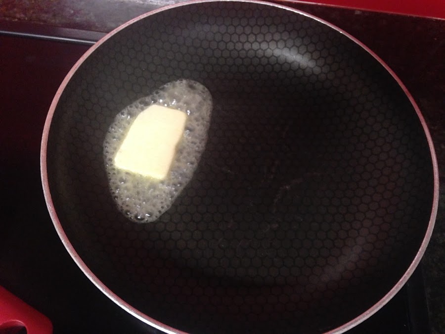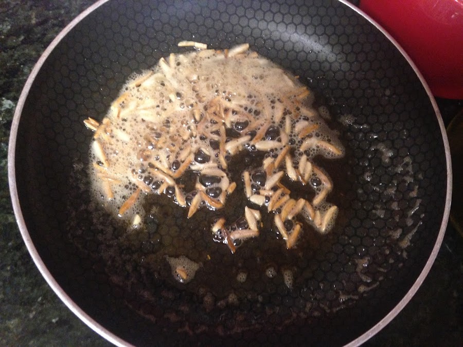 Calentamos la mantequilla en una sartén y tostamos las almendras durante 2 minutos hasta que se doren muy ligeramente.